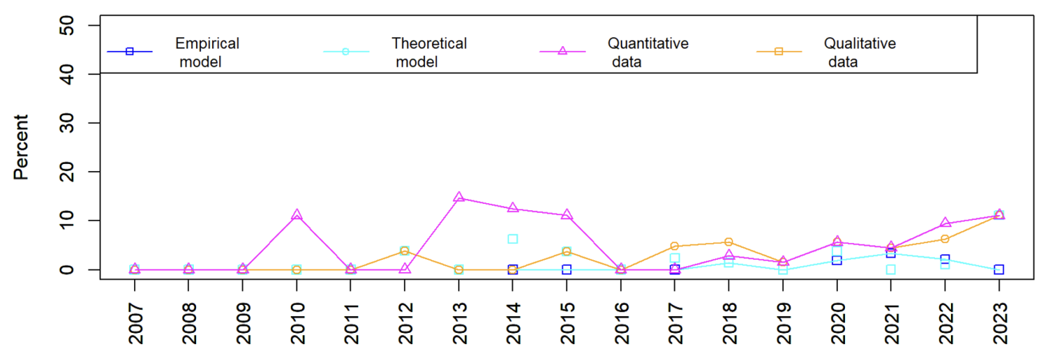 대부분의 연구(거의 90%)는 분석이 아닌 의견이다. 이론적 모델을 사용한 연구는 9건(표본의 1.6%), 실증적 모델을 사용한 연구는 8건(1.4%), 정량적 데이터 분석은 31건(5.5%), 정성적 데이터 분석(예: 인터뷰)은 23건(4.1%)에 불과했다. 그림 3에서 볼 수 있듯이 구체적인 방법을 사용한 연구의 비중이 증가하는 추세는 뚜렷하지 않다.