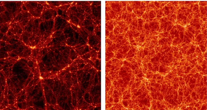 그림 01 암흑 에너지와 암흑 물질이 포함된 우주(왼쪽)와 암흑 에너지가 없는 우주(오른쪽)의 물질 분포를 비교한 시뮬레이션 결과는 이를 잘 보여준다. 해당 시뮬레이션은 독일 그라칭에 위치한 막스 플랑크 계산 센터와 영국 에든버러 병렬 컴퓨팅 센터의 슈퍼컴퓨터를 이용해, 버고(Virgo) 슈퍼컴퓨팅 컨소시엄이 수행했다. 이 데이터는 공개적으로 제공되며, 자세한 내용은 다음 링크에서 확인할 수 있다: https://www.mpa-garching.mpg.de/galform/virgo/int_sims. 출처: 버고 슈퍼컴퓨팅 컨소시엄.