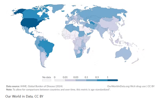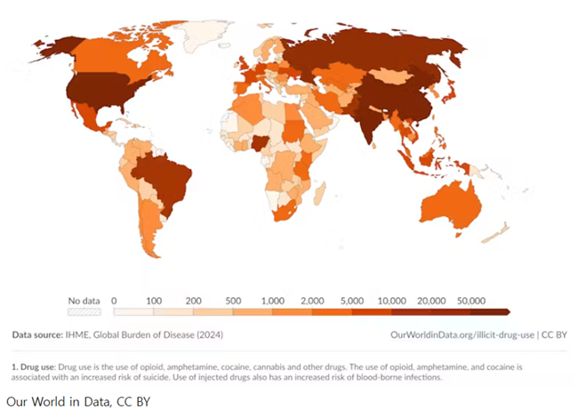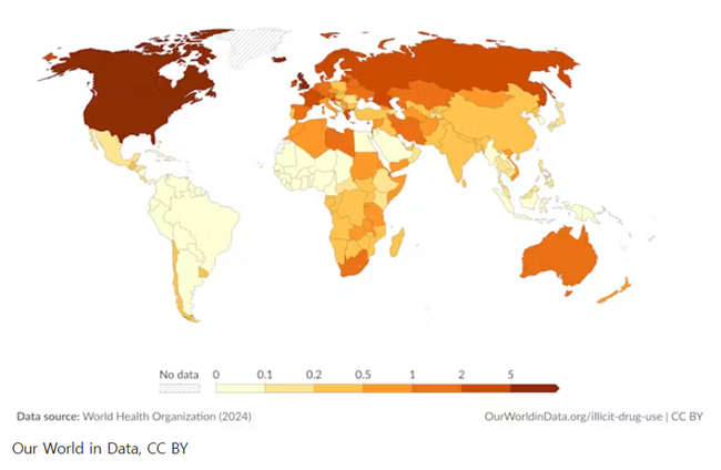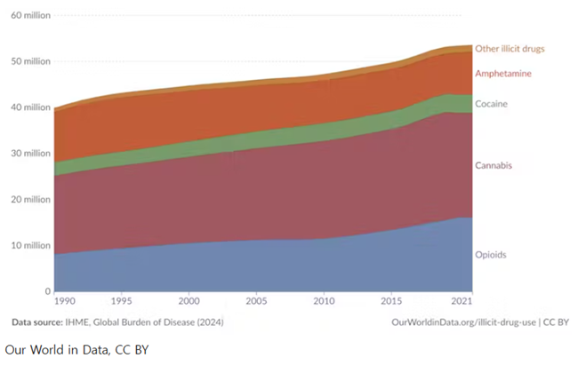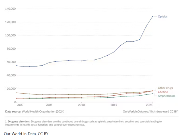 마약 사용으로 인한 가장 심각한 질병 부담은 여전히 오피오이드에서 발생하며, 2019년 이후 다른 마약들과는 달리 오피오이드 사용이 전 세계적으로 안정적인 수준을 유지하고 있다.