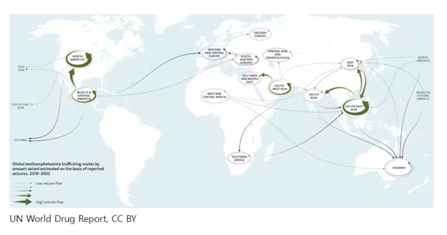 한편, 서방의 코카인 시장이 포화 상태에 이르자 조직범죄 갱단은 아시아에서 새로운 시장을 개척했다. 이는 코카인 사용의 지표가 되는 마약 압수량 증가로 나타났다. 그러나 이와 같은 지형 변화는 소비 패턴에도 반영되어, 아시아에서는 합성 자극제인 메스암페타민 사용이 급격히 증가하고 있으며, 이는 2023년 해당 지역에서 기록적인 마약 압수량으로 이어졌다.