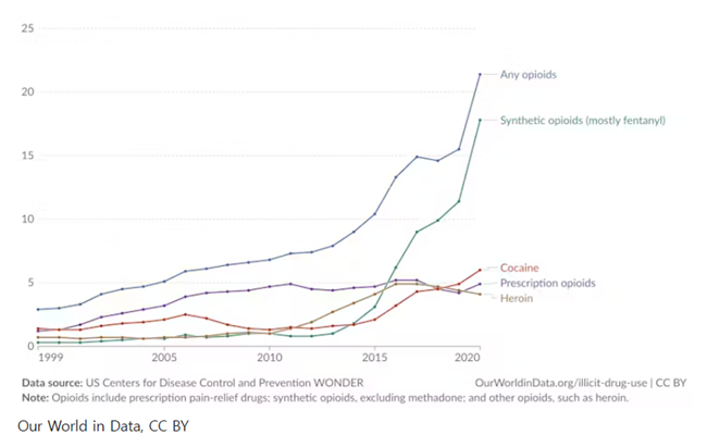 미국의 약물 유형별 과다복용 사망률 (1999-2020)
