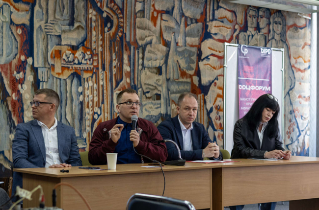 비탈리이 두딘(Vitaliy Dudin)은 4월 27일 소찰니 루흐(Sotsialnyi Rukh) 주최로 열린 “전시 상황에서 핵심 기반시설 노동자 보호” 회의에서 연설했다. 출처 : 테이아 샤텔(Theia Chatelle)