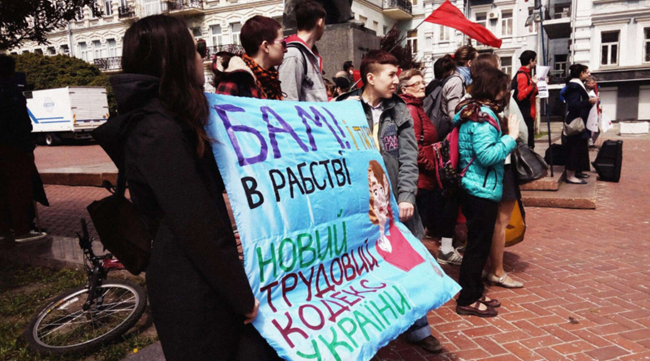 왼쪽 팻말에는 “개정 노동법전”이라고 적혀 있고, 오른쪽 팻말에는 “노동자 권리”라고 적혀 있다. 출처: 소찰니 루흐(Sotsialnyi Rukh)