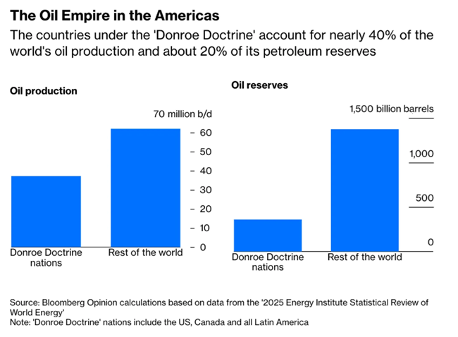 ‘돈로 독트린’ 아래에 놓인 국가들은 전 세계 석유 생산의 약 40%, 전 세계 석유 매장량의 약20%를 차지한다. 출처: 블룸버그 오피니언 분석. 에너지 연구소 세계 에너지 통계 연감> 기반