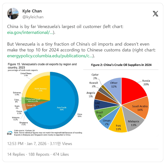 중국은 베네수엘라의 석유를 가장 많이 사들이는 나라다. (왼쪽 차트 출처: eia.gov/international/…) 그러나 베네수엘라는 중국 전체 석유 수입에서 차지하는 비중으로 보면 극히 작은 부분에 불과하며, 중국 세관 자료 기준으로는 2024년 상위 10위 공급국에도 들지 못한다. (오른쪽 차트 출처: energypolicy.columbia.edu/publications/…)