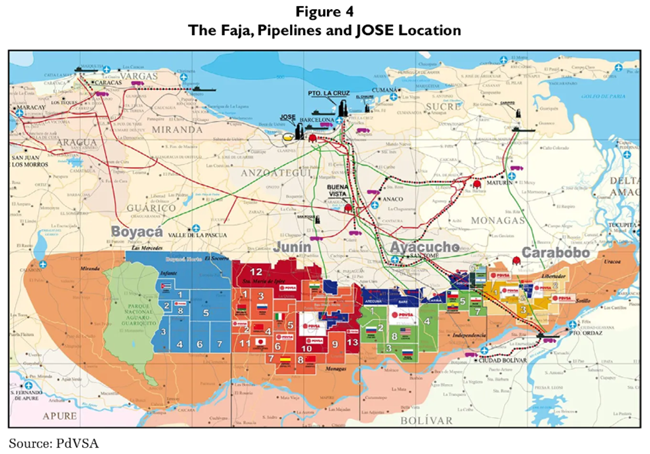 <파하(Faja), 파이프라인, 그리고 호세(JOSE)의 위치> 지도는 베네수엘라 오리노코 석유 벨트 지역을 중심으로 석유 블록(색상과 번호로 구분됨). 원유·가스 파이프라인 경로 호세 산업 단지 및 수출 터미널의 위치를 함께 보여준다.