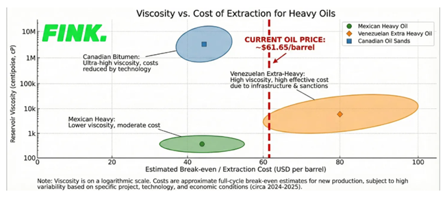 <점도 대 중질유 채굴 비용의 관계> 점도가 높을수록 채굴 비용이 급격히 상승하며, 베네수엘라 초중질유는 점도 자체도 매우 높고 제재·인프라 문제까지 겹쳐 현재 유가 수준에서는 경제성이 특히 나쁘다는 점을 시각적으로 보여주는 그래프다.
