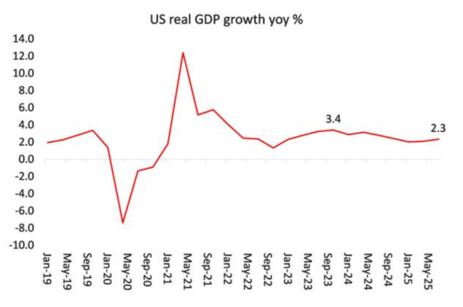 이제 이러한 주장들을 하나씩 살펴볼 필요가 있다. 2025년 3분기 미국의 실질 국내총생산(GDP) 성장률은 연율 기준 4.4%로 집계됐는데이는 지난 2년 사이 가장 높은 연율 성장률이며 시장 예상치를 크게 웃도는 수치였다겉보기에는 이 4%가 넘는 성장률이 대단해 보인다그러나 문제는 세부 내용에 있다첫째이는 연율 기준 수치다즉 분기 대비 성장률은 약 1.1%에 불과하며이를 네 배로 환산해 연율 수치를 만든 것이다둘째전년 동기 대비 기준으로 보면(2025년 3분기와 2024년 3분기 비교), 실질 GDP 성장률은 2.3%에 그쳤다이는 2분기의 2.1%에서 소폭 상승한 수준에 불과하다.