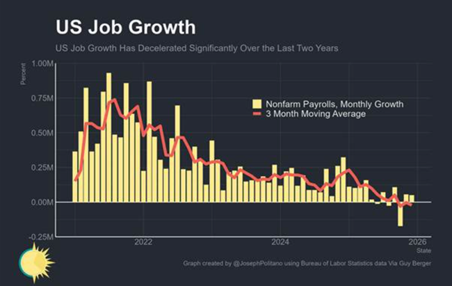 그러나 관세 인상에도 인플레이션이 가속되지 않을 가능성도 있다미국의 고용 시장은 이미 상당히 둔화했다. 2025년 전체 고용 증가 규모는 58만 4천 명에 그쳤으며월평균 증가폭은 4만 9천 명으로 2024년에 200만 명 증가에 비하면 4분의 수준에 불과하다실제로 2025년 하반기에는 신규 일자리 증가가 전혀 없었고실업률은 소폭 상승했다.