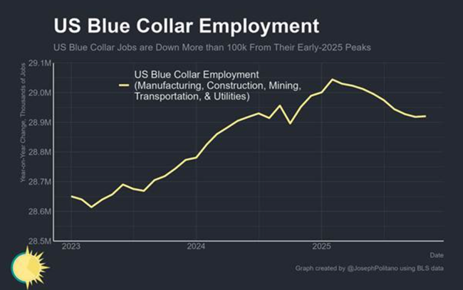 트럼프는 자신의 수입 관세가 해외에 있던 제조업 일자리를 미국으로 되돌려올 것이라고 자랑했다그러나 지난 1년 동안 미국의 산업 일자리는 6만 5천 개 감소했으며이는 2024년에 25만 개의 일자리가 늘어났던 것과 비교하면 극적인 반전이다올해에는 건설광업공공 유틸리티를 포함한 모든 블루칼라 부문에 큰 둔화가 닥쳤지만미국의 일자리 감소 대부분은 제조업과 운송업이 주도하고 있다.