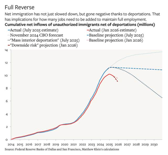 트럼프는 자신의 가혹한 비자 제한 정책과 미국 시민을 상대로 한 끔찍한 이민세관단속국(ICE)의 공격이 이 나라로 유입되는 이민의 흐름을 끝낼 것이라고 주장했다그리고 그는 옳았다. 2025년에 추방 조치로 미국 인구는 60~110만 명까지 감소했으며이는 바이든 집권 하에서 2022년과 2023년에 해마다 250만 명씩 인구가 증가했고 2024년에도 150만 명이 늘어났던 것과 대비된다.