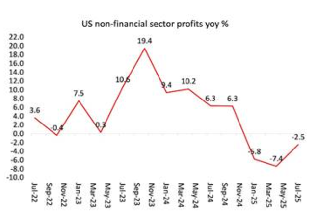 그렇다면 기업 이윤은 어떠한가이것이 투자를 늘리고 그 결과 경제 성장을 촉진할까기업 이윤 마진율즉 산출 단위당 이윤은 22.4%로 역사적으로 높은 수준 근처에 머물러 있다또한 2025년 3분기 기업 이윤은 상반기에 감소한 뒤 1660억 달러 급증했다그러나 여기에서도 겉으로 보이는 수치는 오해를 낳는다. 3분기에 큰 폭으로 증가했음에도 비금융 기업 부문의 이윤은 지난해 같은 분기와 비교하면 여전히 2.5% 감소한 상태다.