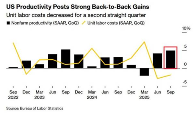 그렇다면 노동 생산성이 급격히 상승한다면 상황은 달라질까그렇게 되면 미국 기업들의 단위 노동비용이 낮아져 수입 가격 상승을 흡수하면서도 합리적인 수준의 이윤 증가를 유지할 수 있을까미국의 노동 생산성은 2025년 3분기에 연이율 기준 4.9% 상승했으며이는 지난 2년 동안 가장 강한 상승세다그 결과 단위 노동비용은 3분기에 1.9% 하락했으며이는 2분기에 이어진 감소로 2019년 이후 처음으로 두 분기 연속 하락이다그렇다면 인공지능 생산성 붐이 실제로 도래해 기업들이 새로운 노동자를 추가할 필요 없이도 실질적으로 성장할 수 있게 되면서, 2026년까지 미국 경제와 트럼프를 구해 줄 것일까.