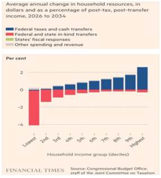 미국 다수 가계에는 앞으로 더 많은 타격이 기다리고 있다트럼프의 이른바 크고 아름다운” 재정 법안이 이제 시행에 들어갔다트럼프는 팁에 대한 무과세나 기타 소규모 조치를 떠들고 있지만핵심 내용은 기업 이윤세 감세와 메디케이드 및 식량 보조 프로그램 삭감이다미 의회예산처는 이 법안이 소득 하위 40% 미국인의 소득을 줄이지만상위 20%는 큰 이익을 얻게 될 것이라고 추산했다.