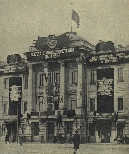 모스크바 트레르스코이 지구에 있는 Дом союзов(house of union)의 1928년 모습. 외벽에 콤소몰 8차 대회 관련 플래카드가 걸려있다. 출처: 러시아 잡지 <Смена> 10호(1928년 5월)