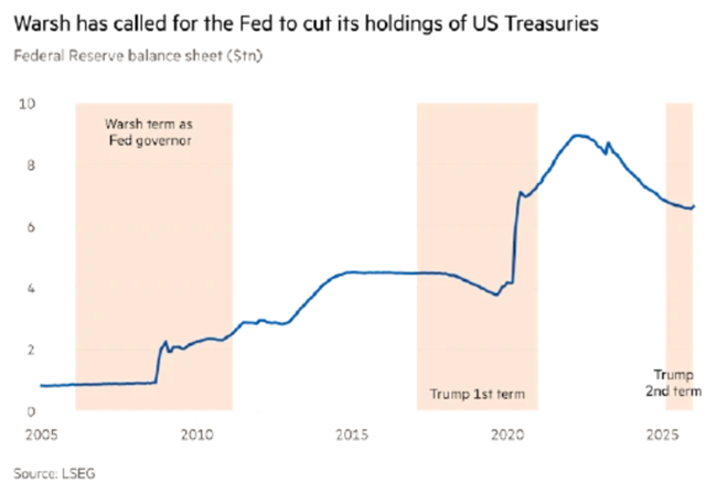 워시는 연방준비제도 이사였으나, 금융위기 구제금융 이후 오바마가 대통령에 취임하고 버냉키 의장이 ‘양적 완화(Quantitative Easing, QE)’ 정책을 추진하자 사임했다. 이 정책은 연준이 은행 체계를 떠받치고 금리를 낮게 유지하기 위해 수천억 달러를 투입하는 방식이었다. 워시는 QE에 반대했다. 그는 전형적인 ‘오스트리아 학파’ 자유시장주의자였다. 그는 연준의 통화 공급 확대가 “경제에서 자본의 잘못된 배분과 정부에서 책임의 잘못된 배분을 초래한다”고 보았다. 그는 중앙은행들이 ‘화폐 발행’에 중독돼 있으며, 그 결과 “무모할 정도로 큰 공공부문 재정적자”를 부추긴다고 오랫동안 믿어왔다. 그는 과도한 경제 지원과 과도한 정부 지출을 모두 반대했다. <파이낸셜 타임스>의 크리스 자일스(Chris Giles)를 인용하면, 워시는 연준 이사들이 “인플레이션이라는 본연의 임무에만 집중하고 환경 문제나 소득 분배 문제에 한눈을 팔아서는 안 된다”고 생각한다. 불평등 완화는 워시의 의제에 없다.