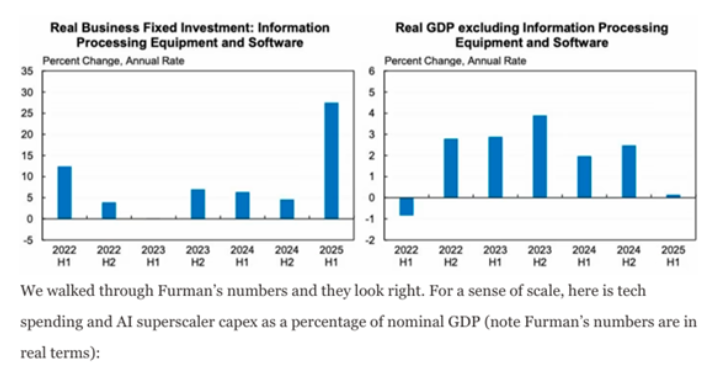 (왼쪽) 실질 기업 설비 투자: 정보처리 장비와 소프트웨어, (오른쪽) 정보처리 장비와 소프트웨어를 제외한 실질 GDP. 퍼먼(Furman)의 수치를 검토해 본 결과 타당해 보인다. 규모를 가늠하기 위해, 다음은 기술 지출 및 AI 하이퍼스케일러의 자본 지출을 명목 GDP 대비 비율로 나타낸 것이다 (참고로 퍼먼의 수치는 실질 기준이다).