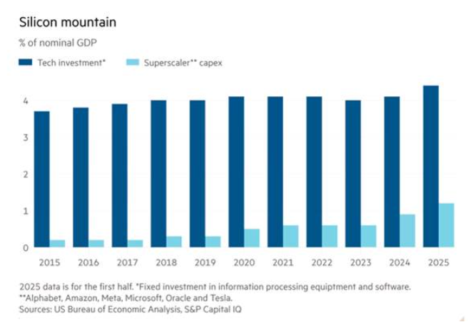 미국의 경제 활동이 전적으로 정보기술 투자로 좌우된다고 말하는 것은 완전히 정확하지 않다. 데이터센터에 들어가는 많은 장비가이 수입품이기 때문에, 이는 GDP에 대한 부(-)의 기여로 상쇄된다. 그런데도 ‘실리콘 산맥’은 계속 솟구치고 있다.