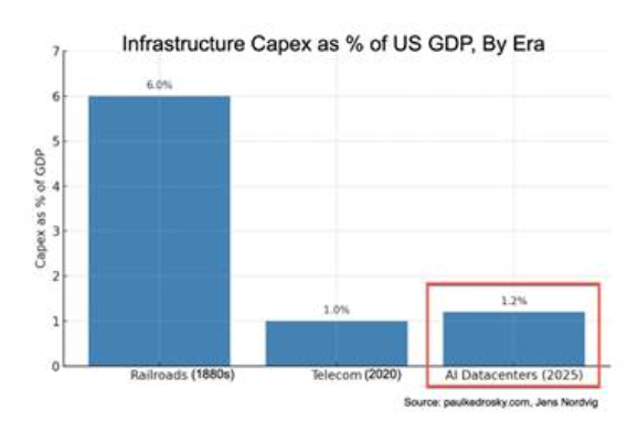 시대별 인프라 자본지출의 미국 GDP 대비 비율, GDP 대비 자본지출 비율(%), 철도 (1880년대): 6.0%, 통신 (2020년): 1.0%, AI 데이터센터 (2025년 예상): 1.2%, 출처: peakedrosky.com, 옌스 노르드비히