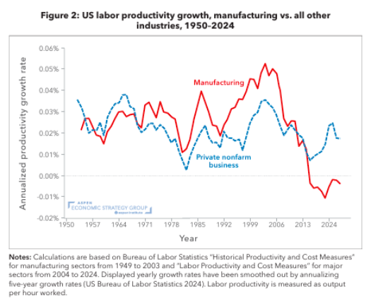 미국 노동생산성 증가율 – 제조업 vs. 기타 산업 (1950~2024), 연평균 생산성 증가율/ 범례: 제조업, 민간 비농업 부문. 계산은 미국 노동통계국(Bureau of Labor Statistics)의 '역사적 생산성과 비용 지표(Historical Productivity and Cost Measures)'를 기반으로 했으며, 제조업 부문의 데이터는 1949~2003년, 주요 산업 부문은 2004~2024년 데이터를 사용함. 표시된 연간 성장률은 5년 이동평균을 연이율 화한 값임 (미국 노동통계국 2024년). 노동생산성은 시간당 산출량으로 측정됨.