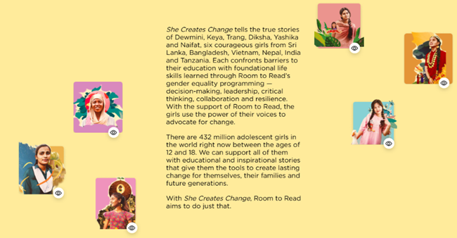 1999년 설립된 '룸투리드(Room to Read)'는 성평등과 문해력 향상을 목적으로 28개 국가에서 활동하고 있다. '그녀는 변화를 만든다'는 이들이 만든 멀티미디어 스토리텔링 프로젝트로 단편 애니메이션과 그림책 등으로 구성되어 있다. 영화에는 6개국(스리랑카, 방글라데시, 베트남, 네팔, 인도, 탄자니아) 여성 청소년들이 등장, 자신들의 변화에 대한 이야기를 펼친다. 이 프로젝트는 영화와 함께 12~18세 청소년 교육을 위한 커리큘럼과 교재를 제공해 그들의 삶과 지역사회 변화를 목표로 하고 있다. 영화와 자료는 홈페이지에서 무료로 받을 수 있으며, 스페인어, 아랍어, 일본어, 프랑스어, 힌디어 등의 언어로도 번역되어 있다. 언어는 앞으로도 계속 추가될 예정이라고 밝혔다.